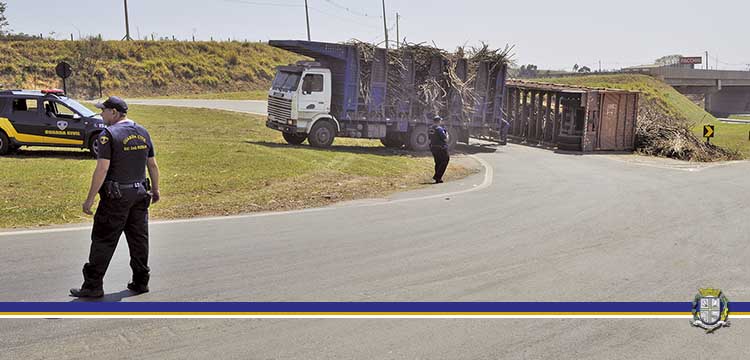 O reboque tipo Julieta de um caminhão que transportava cana de açúcar tombou na rotatória ...