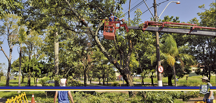 O Departamento de Meio Ambiente realizou a poda de copa de árvores na rotatória da Avenida Elias Cândido Ayres, no ...