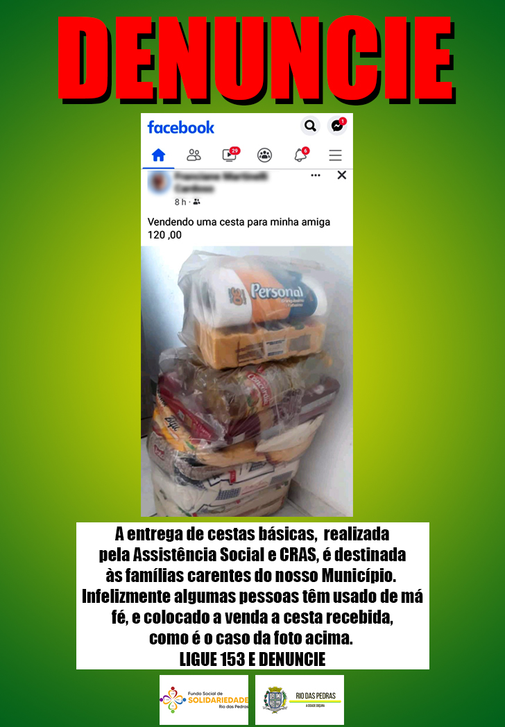 DENUNCIE A VENDA DE CESTAS BASICAS AÇÃO SOCIAL 06-01-2022 Denuncie a venda de Cestas básicas destinadas à famílias carentes pelo 153.Compartilhar WhatsApp