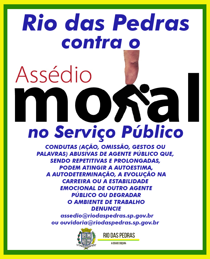 Diga não ao assédio moral. Para formalizar denúncia, basta enviar mensagem para assedio@riodaspedras.sp.gov.br ou ouvidoria@riodaspedras.sp.gov.br.