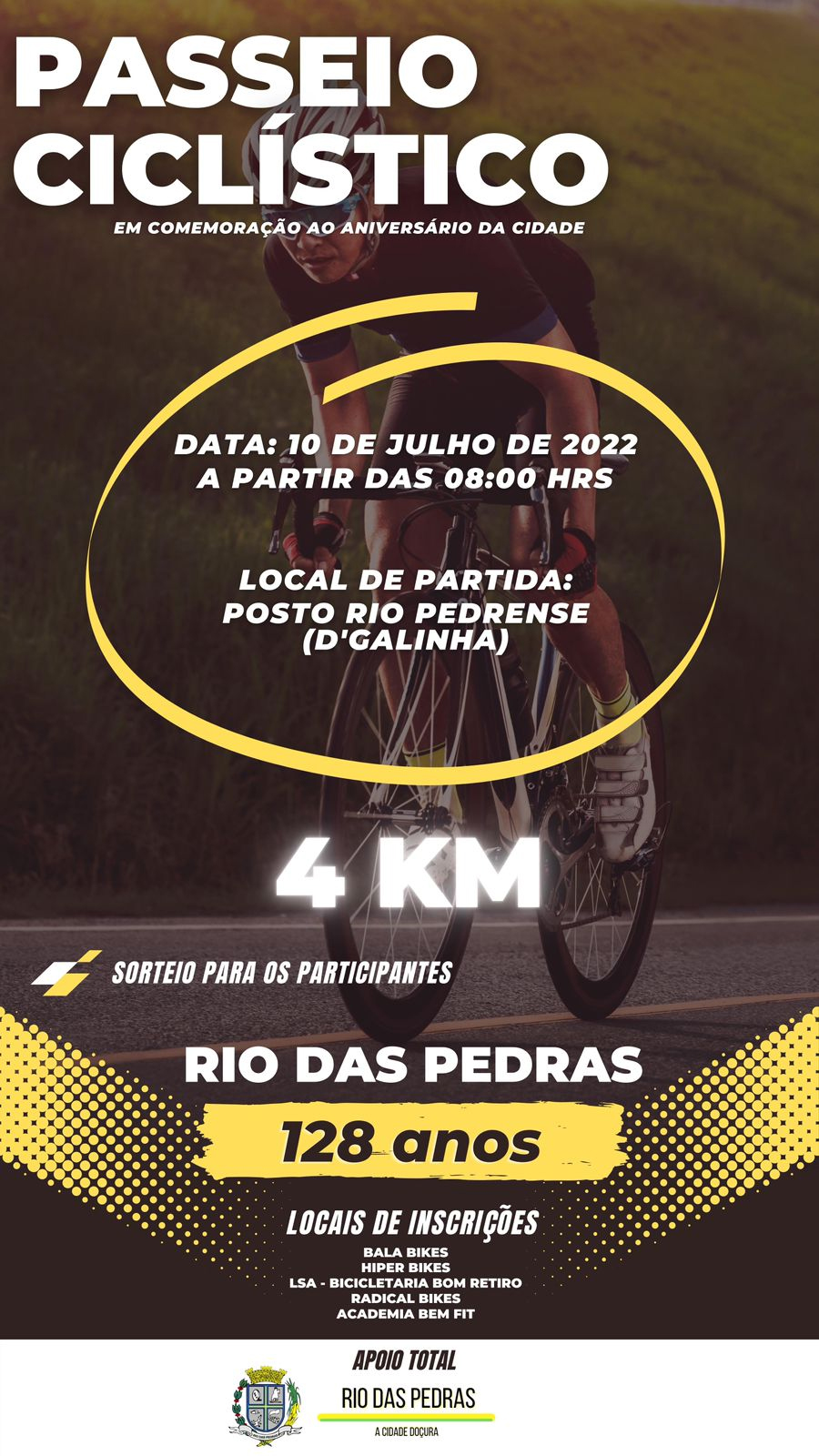 Neste domingo a parir das 8h acontece o Passeio CiclÃstico em comemoração aos 128 anos de Rio das Pedras.