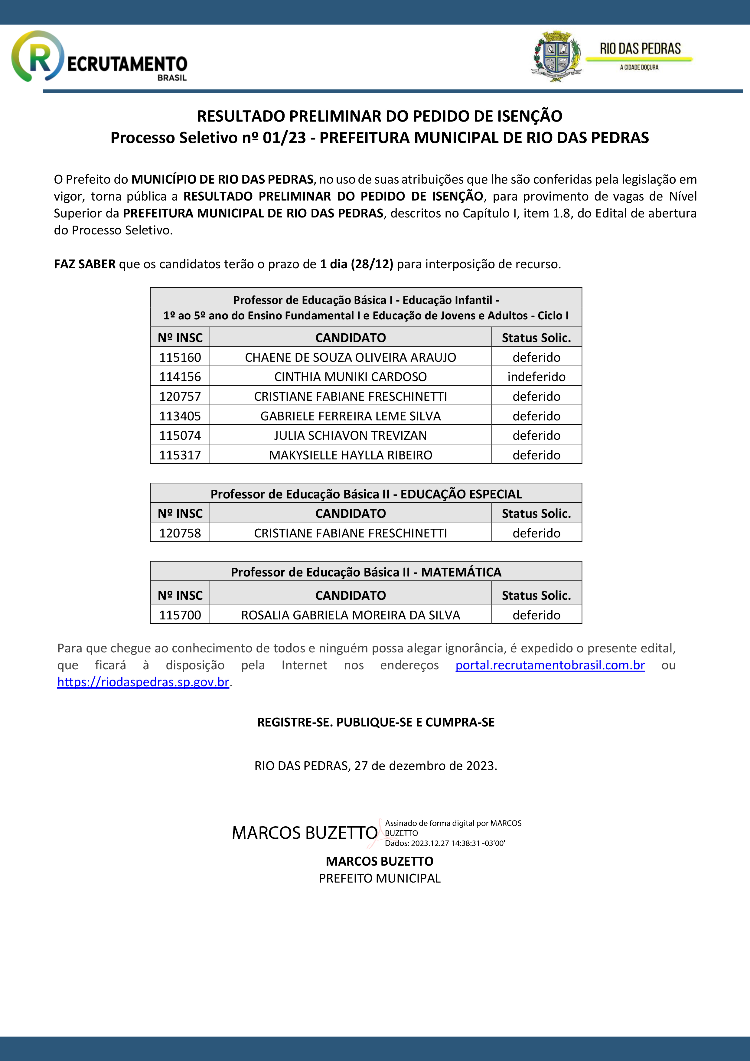 Confira na imagem a lista dos Pedidos de isenção para Processo Seletivo