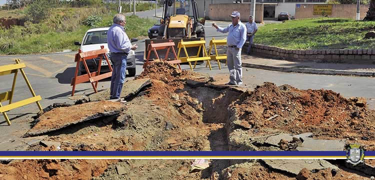A Prefeitura está recuperando o asfalto na rotatória da Av. Pref. Nicolau Marino, em frente ao Departame ...